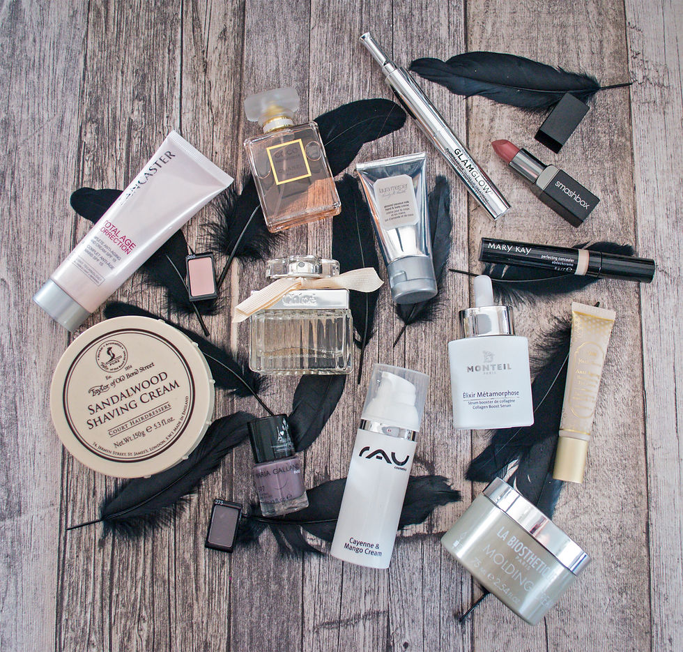 LANCASTER Total Age Correction - Complete Anti-Ageing Hand Cream SPF 15 ca. 20 Euro // CHANEL "Coco Mademoiselle" Eau de Parfum 35ml ca. 67 Euro // LAURA MERCIER Little Indulgences Hand & Body Cream Collection ca. 32 Euro // GLAMGLOW Plumprageous - Gloss Lip treatment "Clear Gloss" ca. 24,99 Euro // SMASHBOX "Be Legendary" Lipstick Collection "Audition" ca. 22 Euro // MARY KAY Perfecting Concealer "Light Ivory" ca. 20 Euro // SABON "Youth Secrets" Rejuvenating Eye Cream ca. 52 Euro // LA BIOSTHETIQUE Molding Cream ca. 20,80 Euro // MONTEIL "Elixir Métamorphose Collagen Boost Serum ca. 49 Euro // RAU COSMETICS Cayenne & Mango Cream ca. 38,80 Euro // CHLOÉ "Fleur de Parfum" Eau de Parfum 50 ml ca. 82 Euro // ARABESQUE Lidschatten "260 Zart Rosé Matt" & "273 schiefergrau Matt" je ca. 5,90 Euro // TAYLOR OF OLD BOND STREET Sandelholz Shaving Cream ca. 9,50 Euro // MARIA GALLAND 507 Le vernis Nail Polish "56 Taupe Chic" ca. 18,50 Euro // Raben-Federn von HOTEX
