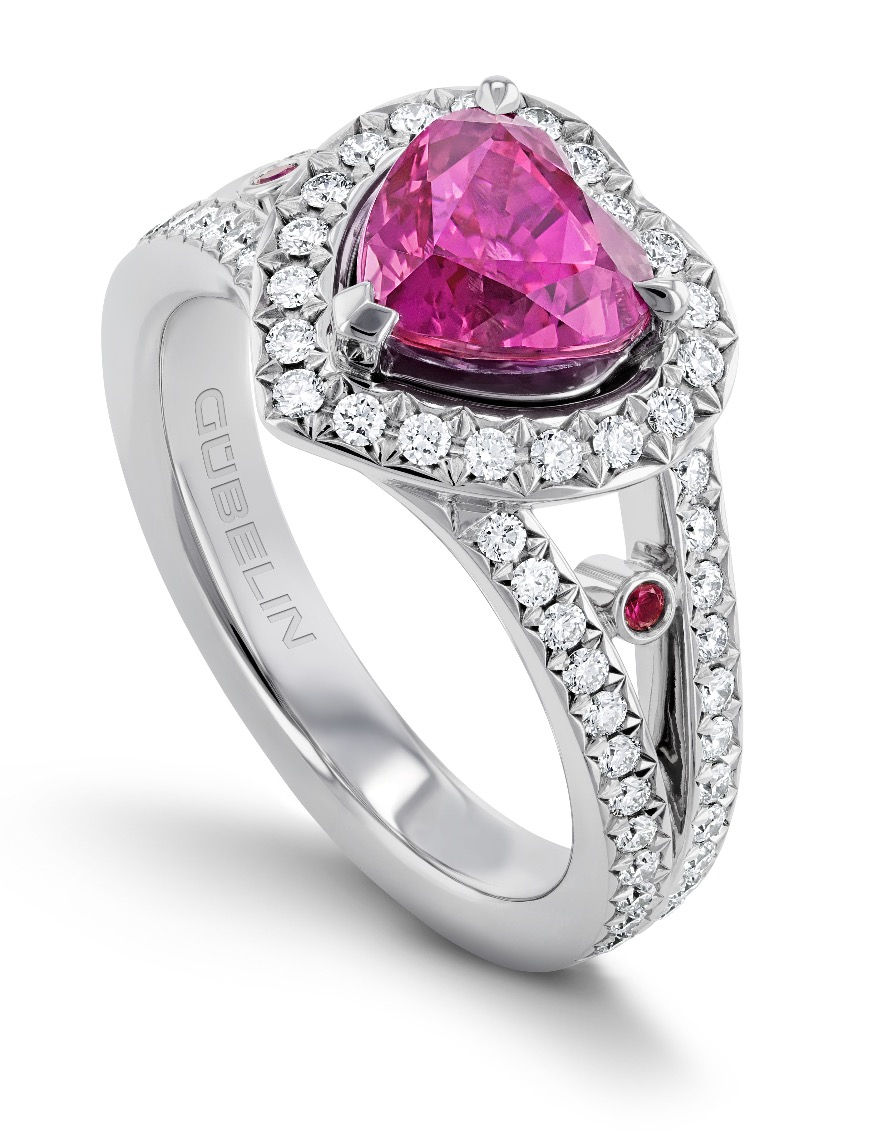 Die Gübelin Designer haben sich für die Linie «Sparks of Fire» von den spektakulären Farben, Formen und Funken in einem Rubin inspirieren lassen. Diese Einschlüsse erinnern an ein farbenprächtiges Feuerwerk. Die inneren Merkmale in diesem Rubin erzeugen ein raffiniertes Lichtspiel, das eine farbenfrohe Komposition von Interferenzfarben entstehen lässt, wie ein Regenbogen aus lauter Funken.