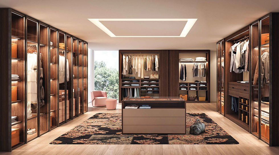 Die begehbare Schrankkollektion von Estel besteht aus ein- oder zweitürigen Schranksäulen, die in verschiedenen Höhen erhältlich sind. Die Türen sind in Melamin, lackiertem Finish, Furnier oder mit einer Glastür mit lackiertem Metallprofil erhältlich. Glasböden mit Metallrahmen und Beleuchtungssystem machen die Sicht auf die im Kleiderschrank aufbewahrten Gegenstände einfach und szenografisch. Der charakteristische dicke Holzrahmen macht dieses begehbare Schranksystem einzigartig und schafft eine angenehme Abfolge von offenen und geschlossenen Fächern. Eine Vielzahl von Accessoires vervollständigt eine äußerst anpassbare Kollektion.