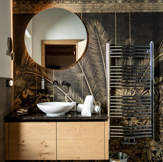 Natürliche Materialien, wie Stein und Holz, zeichnen den typischen Tiroler Stil nach und strahlen pure Gemütlichkeit aus. Jedes Chalet verzaubert mit seinem eigenen Motto und individuellem Interieur aus hochwertigen Stoffen und Möbeln sowie stilsicher ausgewählten und sorgsam platzierten Accessoires. Vorherrschend sind dezente, erdige Farben wie grau, braun, grün und da und dort ein kaiserliches Rot. Der Kamin verströhmt wohlige Wärme und lädt ein, vor dem knisternden Feuer, gemütlich auf der Couch zu entspannen.